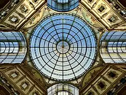The Milan gallery and its roof have been acknowledged as an important reference on 19th-century iron-and-glass architecture by Pevsner[4] and Hitchcock.[5] As one can still observe today, the roof consists of four barrel vaults (approximately 14.5 m in width and 8.5 m in height) that are crowned with a huge dome (around 37.5 m as internal diameter and 17.10 m in height).[6] Jorini pointed out the accomplishments of this dome with special regard to the large dimensions.[7] Each of the roof parts is topped with a lantern.