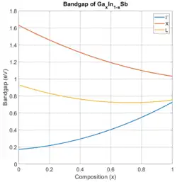 The bandgap and lattice constant of GaInSb alloys are between those of pure GaSb (a = 0.610 nm, Eg = 0.73 eV) and InSb (a = 0.648 nm, Eg = 0.17 eV).[4] Over all compositions, the bandgap is direct, like in pure GaSb and InSb.