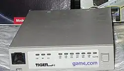 The Game.com[a] is a fifth-generation handheld game console developed and released by Tiger Electronics on September 12, 1997.[4] Designed as a multimedia device for older audiences, it aimed to combine gaming with early digital functions such as touchscreen input and limited Internet connectivity. The original model features a monochrome touchscreen, dual cartridge slots, and could be connected to a 14.4 kbit/s modem for access to e-mail and basic web functions via a proprietary interface.[5] Its name is a reference to the .com top-level domain, reflecting its Internet-related features.[6] It was the first game console to include a touchscreen and the first handheld to offer Internet connectivity, positioning it as an early forerunner in multifunctional handheld gaming devices.