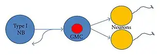 Ganglion mother cells (GMCs) are cells involved in neurogenesis, in non-mammals, that divide only once to give rise to two neurons, or one neuron and one glial cell or two glial cells,[2] and are present only in the central nervous system. They are also responsible for transcription factor expression. While each ganglion mother cell necessarily gives rise to two neurons, a neuroblast can asymmetrically divide multiple times.[3] GMCs are the progeny of type I neuroblasts. Neuroblasts asymmetrically divide during embryogenesis to create GMCs.[4] GMCs are only present in certain species and only during the embryonic and larval stages of life. Recent research has shown that there is an intermediate stage between a GMC and two neurons. The GMC forms two ganglion cells which then develop into neurons or glial cells.[5] Embryonic neurogenesis has been extensively studied in Drosophila melanogaster embryos and larvae.