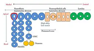 During the embryonic development of Drosophila, neuroblasts delaminate from their respective positions in the embryo and move towards the interior forming a ventral monolayer of cells, known as the neurogenic region.[4] The region is bilaterally symmetrical. The equivalent regions of neuronal growth in other common animal models do not have this symmetrical property, which makes Drosophila preferable for neurogenic study. The neurogenic region is composed of neuroblasts that divide and migrate throughout embryonic development. A larva embryo will contain about 30 neuroblasts per hemisegment of neurogenic tissue.[2] At a certain point, a neuroblast will undergo asymmetric cell division giving rise to a neuroblast and a ganglion mother cell. Each neuroblast can be traced through a lineage using methods such as green fluorescent protein transgene expression in order to investigate mechanisms of cellular diversity. A neuroblast lineage can produce as few as 3 GMCs or up to 20.[2] Research has been conducted to observe the movement of neuroblasts and GMCs in the neurogenic region during embryonic development using molecular markers.[4]