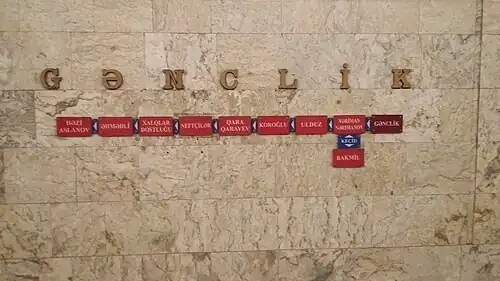Ganjlik (Azerbaijani: Gənclik) is a Baku Metro station. It was opened on 6 November 1967.[1] There is also a direct exit from the metro station to the shopping mall Ganjlik Mall[2] and to Tofiq Bahramov Republican Stadium.