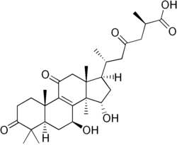 Ganoderic acids are a class of closely related triterpenoids (derivatives from lanosterol) found in Ganoderma mushrooms. For thousands of years, the fruiting bodies of Ganoderma fungi have been used in traditional medicines in East Asia.[1][2] Consequently, there have been efforts to identify the chemical constituents that may be responsible for the putative pharmacological effects. The two most well described ganoderic acids out of the many that have been identified and characterized are ganoderic acids A and B. Some ganoderic acids have been found to possess biological activities including hepatoprotection,[3] anti-tumor effects,[4] and 5-alpha reductase inhibition.[5]