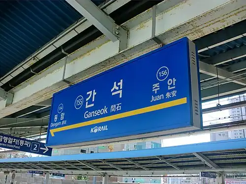 Ganseok Station (Korean: 간석역; Hanja: 間石驛; RR: Ganseok-yeok) is a station on Seoul Metropolitan Subway Line 1 and Gyeongin Line.