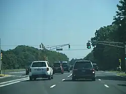 The parkway serves as a major route connecting North Jersey with all of the state's shore points, and as such, is subject to frequent congestion. The number of lanes on the parkway ranges from four in Cape May, Atlantic, and Bergen counties, to 15 on the Driscoll Bridge. Much of the highway runs closely parallel to, or concurrently with U.S. Route 9.[3] The speed limit on the parkway is 65 mph (105 km/h) for most of its length. However, it is posted at 55 mph (90 km/h) on a five-mile (8.0 km) section near Toms River and on a 40-mile (64 km) section between Sayreville and Paramus.[3] The NJTA may temporarily reduce the speed limit when special hazards exist.[4] Commercial trucks with a registered weight of over 10,000 pounds (4,500 kg) are not allowed to use the parkway north of exit 105, just past the Asbury Park Toll Plaza.[5] The entire length of the Garden State Parkway carries the unsigned designation of Route 444,[1] and is part of the National Highway System,[6] a network of roads important to the country's economy, defense, and mobility.[7]