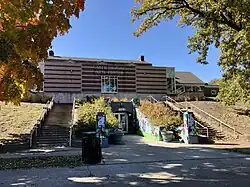 The Community House (or as it was also known, the Shelter House) was built in 1922. Located in the center of the park on the hillside to the west of Bean Creek, it was designed to look like a picnic shelter with enclosing walls, high ceilings, and fireplaces at each end.[6] It served as the site of the Children's Museum of Indianapolis for one year in 1926.[21] The basement, which has a ground-level entrance at the bottom of the hill, originally was used as a children's playroom. In 1930, an outdoor swimming pool was constructed at the bottom of the hill between the Community House and the creek, and the basement was converted into locker rooms.[22] The main floor also served as a small basketball court. In the late 1990s, the old pool was removed because it had deteriorated and had been replaced by the Aquatic Center. In 2006 the Community House was remodeled and enlarged using a $2.7 million grant from Lilly Endowment to become the Garfield Park Arts Center. The 8,000 square foot (740 m2) facility now houses a multi-use performing arts space, an exhibition hall, visual and production arts classrooms, a recording studio, a literary arts library, and a rehearsal room.[23]