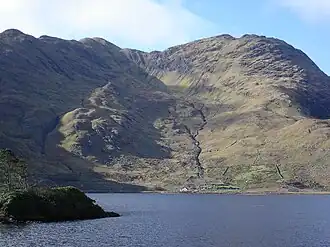 Further southwest again, lies the double-top summit of Doughruagh 526 metres (1,726 ft) (Irish: Dúchruach, meaning "black stack"),[2] which directly overlooks Kylemore Abbey (and thus features in photographs and paintings of the abbey), and whose prominence of 211 metres (692 ft) qualifies it as an Arderin, and a Marilyn.[5] Half-way up the south face of Doughraugh, on very steep ground, is a statue of the Sacred Heart, erected in 1932 by the Benedictine nuns of Kylemore Abbey, in thanks for their safe delivery from their previous home in Ypres in Belgium, which they had to abandon during World War One.[7][2]