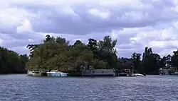 It is 330 m upstream from Tagg's Island[n 2] which is more than twice the width and length. On the island are 20 houses, it being historically divided into 26 plots, but two of these, including the eastern tip, have always been trees and mooring space, respectively. Two of the approximately equal-sized plots, with few exceptions, have been combined into one. It is inaccessible except by boat.[1]