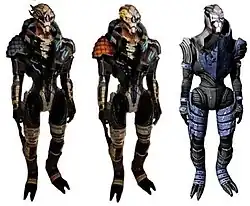 Garrus is a turian, an alien race with avian features, from a society which values discipline and possesses a strong sense of personal and collective honor.[2] Turians resemble "humanoid birds or raptors"; they have an eagle-like head with the crest of a plumed bird, avian legs with bones jutting from their calves, and a carapace on their shoulder blades which protects them from the radiation on their homeworld Palaven.[3] Designwise, Garrus wears a visor and has a blue-and-black theme to his armor. In Mass Effect 2, while in Omega, Garrus is seriously injured by a gunship's weapons, leaving him with scars and cracked armor.