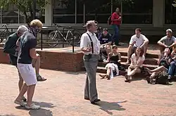Birdsong was issued a trespass warning that prohibited him from entering The Pit for two years. Following the incident, he returned to preach, initially in front of Davis Library, about 100 feet from The Pit, and later about 200 feet away, in front of Wilson Library on Polk Place, which he referred to as "the Homo Zone".[4] During this dislocation, he was sometimes referred to as the "adjacent to the Pit preacher".[6] In March 2009, Birdsong's two-year banishment from The Pit expired and he once again returned to preach in The Pit. Some students were glad to see him return to this popular spot after his extended absence,[7] but the overall reaction was mixed.[6] Some disagreed with his beliefs but felt he had a right to be there. Others just found him entertaining.[4]