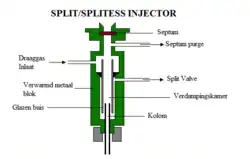 • S/SL (split/splitless) injector – a sample is introduced into a heated small chamber via a syringe through a septum – the heat facilitates volatilization of the sample and sample matrix. The carrier gas then either sweeps the entirety (splitless mode) or a portion (split mode) of the sample into the column. In split mode, a part of the sample/carrier gas mixture in the injection chamber is exhausted through the split vent. Split injection is preferred when working with samples with high analyte concentrations (>0.1%) whereas splitless injection is best suited for trace analysis with low amounts of analytes (<0.01%). In splitless mode the split valve opens after a pre-set amount of time to purge heavier elements that would otherwise contaminate the system. This pre-set (splitless) time should be optimized, the shorter time (e.g., 0.2 min) ensures less tailing but loss in response, the longer time (2 min) increases tailing but also signal.[12]