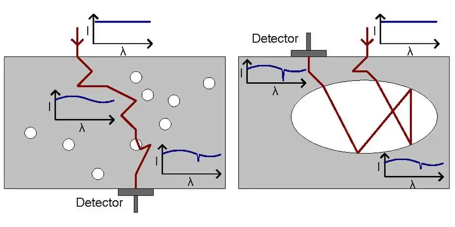 The basic principle of GASMAS is shown in figure 1. Laser light is sent into a sample with gas cavities, which could either be small pores (left) or larger gas-filled chambers. The heterogeneous nature of the porous material often give rise to strong light scattering, and pathlengths are often surprisingly long (10 or 100 times the sample dimension are not uncommon). In addition, light will experience absorption related to the solid material. When travelling through the material, light will travel partly through the pores, and will thus experience the spectrally sharp gas absorption. Light leaving the material will carry this information, and can be collected by a detector either in a transmission mode (left) or in a reflection mode (right).