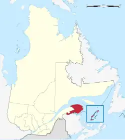 The administrative region of Gaspésie–Îles-de-la-Madeleine was created on December 22, 1987. It brings together two geographical units: the Gaspé Peninsula (20,102.69 km2, 7,761.69 sq mi) and the Magdalen Islands archipelago (205.4 km2, 79.3 sq mi). The population was 90,311 at the time of the 2016 census.[1] The region's interior, 80% of which is covered by coniferous forests, is among the most rugged terrain in the province. Rich soils cover the land along the coast and within the region's river valleys. Important mineral deposits are also found in this region.