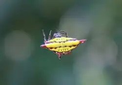 The abdomen is much broader than long and bright yellow with two black cross lines. The lateral corners have thick, blunt spikes with two shorter, sharper spikes both on the front and rear margins. All the spikes are black.