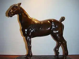 Many works are actually portraits of real horses, which accounts for their realism and accuracy. Some are winners of jumping: Idylle, Bulletin rose, Rosette XIV... Others are his own horses or horses belonging to acquaintances: Violette, Jack, Colibri, Esmeralda, Miss, Prince, Dolly, Sydney, sous-off, Lady Hareford, la ruade or poney Coco ruant, cheval aux champs or Coquet au trot, cheval sans terrasse or Sweetheart. His work was also part of the sculpture event in the art competition at the 1932 Summer Olympics.[3]