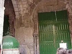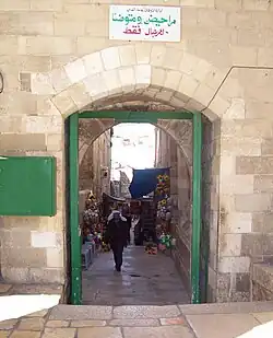 The Cotton Merchants' Gate (Arabic: باب القطانين Bāb al-Qaṭṭānīn Hebrew: שער מוכרי הכותנה) leads onto the Temple Mount. Merchant shops align both sides of the passage-way leading to the Cotton Merchants' gate, a mercantile zone known as the Bazaar of the Haram.[17] The gate was built by the ruler of Damascus, Tankiz, during the reign of Mamluk Sultan ibn Qalawun, as marked by an inscription over the door.[18] Since this site is the closest a person can get to the Foundation Stone (the natural rock and cavern at the center of the Dome of the Rock and thought by some scholars to be the even ha-shetayah) without setting foot on the mount itself, the gate was a popular place of prayer for Jews during the 19th century.