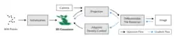 - Optimization algorithm: Optimizing the parameters using stochastic gradient descent to minimize a loss function combining L1 loss and D-SSIM, inspired by the Plenoxels work.[6]