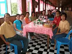 Among the dishes that hold a special place in the festivity, especially among the Iban and Bidayuh, is ayam pansuh (manok pansoh), a traditional chicken dish cooked in a bamboo stalk with onions, ginger, lemongrass, garlic, torched ginger flower, and galangal and roasted in an open fire, which infuses the chicken with a distinctive flavour and aromatic smells.[38] Any remaining meat is preserved in salt and mixed with kepayang leaves and detoxified seeds. Wooden cooking implements are made from small tree logs. Pig heads are roasted on an open fire to be served hot with the traditional Dayak liquor, a rice wine called tuak,[34][39] brewed at least one month before the Gawai Dayak.[40] The drink is brewed from the glutinous rice from a recent harvest mixed with homemade yeast called ciping.[32] Traditionally, tuak was made with rice milk only, but is now cut with sugar and water in a process called manduk.[41] A stronger alcoholic beverage made by the Iban is langkau (also called arak tonok, "burnt spirit" by the Bidayuh). This drink is made by distilling tuak over a fire.[42]