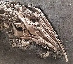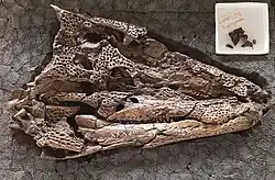 Crocodiles are also documented in large numbers, with around 120 complete skeletons, as well as countless isolated bones and teeth. The alligators are represented by Allognathosuchus, which was only about 0.8 m long and had a rather narrow snout. Diplocynodon is one of the most common forms of crocodile in the Geiseltal and is classified in the extinct group of the Diplocynodontidae. It lived in smaller bodies of water and reached a good 1.3 m in length. A special find includes an almost complete skeleton with bone armor and five eggs in close proximity; it is one of the world's rare examples of brood care in fossil crocodiles.[72] At a good 1.7 m in length, Boverisuchus, a representative of the true crocodiles, is somewhat larger and also numerous. Due to its relatively long limbs and hoof-like spread end phalanges of the toes, this crocodile is assumed to have a more terrestrial lifestyle. The largest predator in the Geiseltal was Asiatosuchus with a body length of around 3 m. It was ecologically similar to today's Nile crocodile and preferred open waters. It is documented with several complete skeletons. In contrast, Bergisuchus appeared extremely rarely with only a few lower jaw fragments, a possibly also more land-dwelling animal that was small in stature at 1.5 m in length. In contrast to the other forms, Bergisuchus represents a primitive and more distant crocodilian relative from the Sebecosuchia group.[73][74] Detailed investigations revealed that all crocodiles in the Geiseltal occupied different ecological niches.[75][76] There are also fragments of crocodile eggs and numerous gastroliths (stomach stones), which prove the presence of crocodiles even without fossil preservation.[77][3]