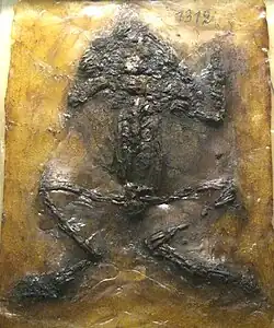 Among the amphibians, the frogs and salamanders are the most important, with 200 to 300 specimens of each, plus numerous individual bones. The articulated skeletons of the frogs are all very fragile, with larger skeletal elements close to the body prevailing over smaller ones far from the body. The remains also include a large number of tadpoles.[54][55] Quite common is Eopelobates from the family of European shovel-footed toads, to which today's spadefoot toad also belongs. Like the latter, Eopelobates lived largely terrestrially. In contrast, the equally common Palaeobatinopsis was an aquatic animal from the Palaeobatrachidae family, a now extinct group of frogs. Further fossil material may well belong to a closely related representative.[56] Of the newts, Palaeoproteus is particularly numerous. It is an amphibious olm that grew up to 25 cm long and had very short limbs. Tylototriton occurs less frequently. This genus, known as crocodile newts, is still found in East and Southeast Asia and its representatives belong to the true salamanders.[57]