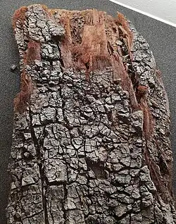 Among the quite common plant remains are pollen and spores as microflora, which alone occupy more than 100 stratigraphically relevant taxa,[34] the macro-remains are particularly important. These include leaves, twigs, branches, bark and stems as well as fruits, seeds and inflorescences. At least 18 families can be identified from the fruits and seeds alone. In total, more than two dozen families with around 40 genera are known. In addition to algae, mosses, primordial ferns - some of these in concentrated enrichments of ribbed ferns and climbing ferns, among others - predominantly remains of the more highly developed seed plants occur.[35] The gymnosperms are represented by palm ferns, some with whole fronds, and conifers with cones and branches. The latter include pines and redwoods, some of which occur in clusters. The latter are classified in the cypress family, of which the extinct genus Doliostrobus has also survived. The remains of the angiosperms are much more extensive. Here the dicotyledons are the largest group with around 20 families. These include laurel and beech families. The latter sometimes also form dense leaf layers, such as in the genus Dryophyllum. Gale shrubs, predominantly fern myrtle, are very common. Plant remains from lime family, Icacinaceae and myrtle family, of which Rhodomyrtophyllum is dominant, are found in large numbers. The long narrow leaves of Apocynophyllum from the dog poison family are also characteristic. Several up to 44 cm long bark remains with the so-called "monkey hair", fossilized milky sap tubes, attached to them are also assigned to this plant family.[36] Monocotyledons have less diversity. Among these, mainly the Arecaceae occur in large numbers and are represented by Sabal and Phoenicites, among others. However, the frequently transmitted palm tribes cannot be precisely classified taxonomically.[37] Other representatives of the monocotyledons have also been described, for example from the lily family and the screw tree family.[38]