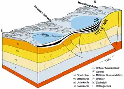 The Geiseltal heutige is increasingly present in its geography. The Neumark main threshold, a rise of the Buntsandstein, divides it into two roughly equal-sized areas, the western and eastern Geiseltal. Secondary and subordinate basins are the Elise basin, the Elisabeth basin, the Wernsdorf basin and others; pre-Tertiary thresholds are the Kayna threshold and the eastern threshold.[5] Geologically, the Geiseltal represents a subsidence structure whose formation has not yet been fully clarified, but which was controlled by several processes. It is possible that in the Palaeogene the leaching of the Zechstein salt combined with the chemical weathering of the shell limestone (subrosion) led to mass loss in the subsoil, which resulted in the subsidence of the overlying layers and the formation of the basin. The salt movement (halokinesis) in particular was associated with tectonic forces in the subsurface, resulting from plate tectonics, which also caused the folding of the Alps during the Cretaceous/Tertiary turn about 65 million years ago. This led to an increase in pressure on the originally flat Zechstein Sea, which then flowed sideways. In the northern area of the Geiseltal, seismic measurements have identified tectonic faults, the so-called Geiseltal-Nordrand-Störung (Geiseltal northern edge fault), which in some places reaches a jump height of up to 200 m in the upper layers (red sandstone).[3][4][6]