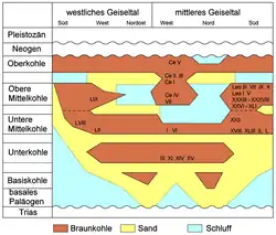 The entire deposits of the Palaeogene reach a thickness of up to around 200 m in the Geiseltal, but are largely limited to the Eocene (56 to 34 million years ago). These Tertiary sediments are initiated by clays and silts as well as partly gröberclastic material. The thickness of the predominantly finely layered to flaky lignite is around 30 to 80 m, but can reach over 120 m in places.[7] In general, the Geiseltal lignite is divided into four main seams, the Lower Coal, Middle Coal (differentiated into Lower and Upper Middle Coal) and Upper Coal, but also has a local Basiskohle in the northern Geiseltal. With the exception of the base coal, all seams are subdivided into further seam sections. The individual seams reach a thickness of 10 to partly 60 m. They are interrupted by sand-silty sedimentary sections (the so-called main middle), which represent guiding horizons and serve to differentiate the seams. In the southern Geiseltal in the open-cast mine Cecilie, however, there was a partially unbroken transition from the middle coal to the upper coal. The extent of the individual coal seams varies from north to south and is linked to the halokinetic and subrosive subsidence of the subsoil. subsidence of the subsurface, but it generally continues further south with the increasing stratigraphic altitude of the seams. Only the Upper Coal is formed throughout the Geiseltal. The very rich Eocene fossil community originates mainly from the Lower Coal and Middle Coal.[8][3][9]