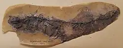 The fish fauna is very extensive with around 2000 specimens, including many complete skeletal individuals, but comprises a total of only 5 families with just as many genera. The most common are the bony fishes, represented by Thaumaturus and Palaeoesox. The former belongs to the salmonid family, the latter to the pike-like family.[51] Another bony fish is Anthracoperca, a relative of the perches. With Cyclurus, there is also a representative of the bony ganoids.[52][53]
