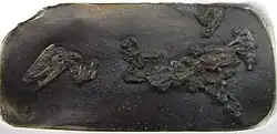 Remains of soft parts have also been preserved in the lignite of the Geiseltal, which is extremely rare. Fossil soft tissues were first discovered in the Geiseltal in 1934, making them one of the very first such finds from the Eocene. The discoveries were only made with the development of the lacquer film method. This made it possible to recognize the fine scale relief in individual fishes, for example in Thaumaturus, as well as in pangolins and more rarely in crocodiles.[126] The skin of numerous frogs could be examined, the individual layers of which, the epidermis and dermis, can be recognized down to the individual cells.[33] Feathers have been found on some remains of birds, some of which were colored; the flight skin of bats has survived. In mammals, such as Amphirhagatherium and more rarely Propalaeotherium, parts of the hair coat have been found.[127][128] It was also possible to document muscles, cartilage and the like, right down to blood cells.[129]