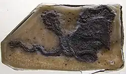In addition, the original coloration of certain soft parts, especially the skin, could be identified. For example, the fish palaeoesox had a zebra pattern on its body and a dark-colored back, while a greenish skin tone could be observed in frogs. In insects, the color shades of the animals are preserved, in plants the chlorophyll has survived.[130] Such chemofossils also include "monkey hair", which is often found in large quantities. These are fibrous, light-brown structures flattened by storage in the lignite, which have been preserved through natural sulphur volcanization. They represent fossilized milky sap tubes of rubber-producing woody plants from the dog poison family, of which leaves of the genus Apocynophyllum are present from the Geiseltal. According to the recent genus Couma, however, the "monkey hair" is referred to Coumoxylon as a form taxon.[131][36][132]