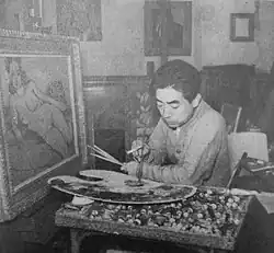 Inokuma built a successful career, being selected for the Teiten almost every year, and after 1933, he was allowed to exhibit at the Teiten without judging.[1] However, in 1936, in protest against the reorganization of the Teiten, Inokuma left the organization and formed the New Creation School Association (Shin seisaku-ha kyōkai 新制作派協会; present Shin seisaku kyōkai 新制作協会) with Masayoshi Ise, Ryōhei Koiso, Toshio Nakanishi, Yasushi Santa, Kei Satō, Iwao Uchida, and Kazu Wakita, who, according to their manifesto, shared the "artistic spirit of ‘anti-academicism’".[5][6] In November of the same year, the first exhibition of the New Creation School Association was held, in which Takeji Fujishima participated as a special exhibitor in addition to the members' works.[3]: 7