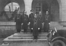 After the German occupation of the Czech lands and the creation of the Slovak Republic, the Gendarmerie came under the control of the government of the Protectorate of Bohemia and Moravia.[8] During the early period of the protectorate, gendarmes continued to deal with communal violence. On 22 July 1939, for instance, Vlajka members conducted an organized attack on Jewish businesses in Prague. The Prague Municipal Police, backed by a Gendarmerie emergency unit, were unable to bring the situation under control and Protectorate officers had to summon Wehrmacht reinforcements to quell the violence.[18]
