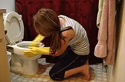 Stephanie Coontz, a professor of family history at Evergreen State College, noted that one of the factors contributing to the gender inequality in the United States is that most men still expect women and men to assume traditional gender roles in the households and for women to carry out a larger share of the housework.[53] This has been confirmed by a number of other studies; for example Makiko Fuwa from University of California, Irvine noted that while there has been movement towards greater equality, "in 1995 American women still spent nearly twice as much time on housework than men" and there is also a segregation of household tasks.[54] This gendered division of household labor creates what is known as the second shift or double burden, where working women in a heterosexual couple with a working partner spend significantly more time on childcare and household chores.[55]