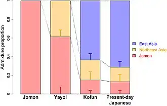 Rui Wang (王瑞) and Chun-Chao Wang (汪群超) (2022) reiterated that Yayoi immigrants did not demographically replace the Jōmon. Instead, they co-existed and intermarried with indigenous Jōmon, which led the Yayoi to have 60% Jōmon ancestry. The rest was Northeast Asian. Jōmon admixture was decreased when ancestries related to the Northern Han Chinese (Yellow River ancestry) were introduced in the Kofun period.[56]
