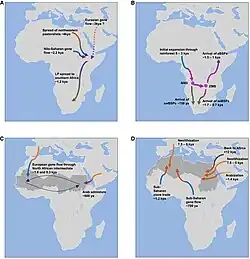 - ^ Kulichova I, et al. (2017). "Internal diversification of non-Sub-Saharan haplogroups in Sahelian populations and the spread of pastoralism beyond the Sahara". American Journal of Biological Anthropology. 164 (2): 424–434. doi:10.1002/ajpa.23285. PMID 28736914.