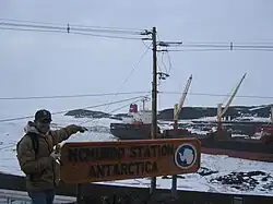 A geocacher finding a virtual cache at McMurdo Station, Antarctica