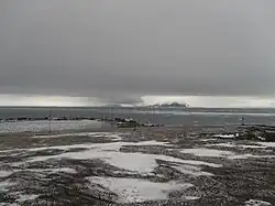Heiss Island and Komsomol Island lie southeast of Zichy land. The Austria Strait separates Hall Island from Komsomol and the large Wilczek Island further to the northeast.[7] Heiss Island, also known as Kheysa or Chejsa island, is bound within latitude 80.55° N and longitude 57.50° E. It encompasses an area of 132.3 square kilometres (51.1 sq mi). Its mapped shore length is 55.2 kilometres (34.3 mi).[10] The abandoned Kheysa, Soviet rocket launching site, was located on this island.[17] In the Geophysical Year 1957–58, a new meteorological station, which over the years became the largest such station, was established on the banks of a small crater lake in the ice free zone of this island and named after Ernst Krenkel, an Arctic explorer. The station was closed in 2000 and abandoned buildings are still seen here. Another weather station was established in 2005. The island is named after the Arctic explorer, Isaac Israel Hayes.[18]
