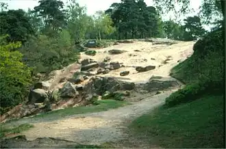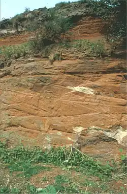 The Alderley sandstones are classic redbed deposits, a distinctive sedimentary facies traditionally associated with non-marine depositional environments such as alluvial floodplains and arid deserts.[5] They form part of the Cheshire Basin and the Edge is one of the classic onshore localities in the UK for their study.[6]