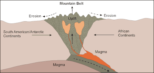 The formation of the Cape Fold Belt is the result of a collision of tectonic plates that ended over 200 million years ago The accumulated strata of the Cape Supergroup and the older granites and Malmesbury group were raised and deformed by the pressure of the South American, Antarctic and African continental plates slowly moving together. The resulting fold mountains have been eroded to their present state over the ensuing period, and what exists today are the remnants of a much larger and higher mountain chain. Faults cut across and displace the rock layers. These more easily eroded zones are marked by ravines; cross-cutting faults separate multiple peaks of the Twelve Apostles. Some fault zones of crushed rock (breccia) are re-cemented by dark brown coloured iron and manganese oxide minerals.[1]