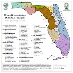 Geomorphology is the study of the origins of landforms. Landforms in Florida include topographical elements such as ridges, valleys, plains, marine terraces, and karst landforms.[7] All of Florida falls within the Coastal Plain of the Eastern United States, and has a maximum elevation above sea level of 104 metres (341 ft). Marine forces have dominated the shaping of landforms in Florida. Geologists began recognizing geomorphological regions in Florida in the late 19th century. In 1913, a report divided the central peninsula of Florida into four sections. A 1939 study divided Florida into more than 60 physiographic regions. A study in 1964 described Florida as having several physiographic regions; the Atlantic Coastal Lowlands, Intermediate Coastal Lowlands, Gulf Coastal Lowlands, Central Highlands, Northern Highlands, and Mariana Lowlands, with almost 100 secondary and tertiary sub-divisions.[8] As of 2022, the Florida Geological Survey has designated 10 geomorphological districts and 71 geomorphological provinces in Florida. The districts share topography that has been produced by related processes. Provinces have shared features that have a common origin. Some of the districts and provinces in northern Florida are only partly in Florida, extending into Georgia or Alabama.[9]