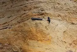 - ^ Gaize (German: Pläner) is a historical or traditional summary term for some marine sedimentary rocks of the Upper Cretaceous, especially the Cenomanian and Turonian of Central Europe and the Baltic States. In modern geological classifications, the word can only be found as part of the name of some lithostratigraphic units, not as a sedimentary petrographic term. Gaize has a relatively well-bedded structure with layer thicknesses of a few millimetres to a maximum of about 1.5 metres. This distinctive stratification has influenced mining of split slabs, blocks or broken material for lime burning. The main mineral constituents of gaize are quartz, calcite, clay minerals and mica (mainly glauconite). Due to the different proportions of the minerals depending on the occurrence, practically the entire range between limestone, quartz sandstone and claystone is covered. The colour of gaizes varies between grey beige and gold beige. In addition, gaize often has a characteristic spotted appearance.