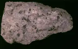 Also known as the Greenwood Granite, the Sutton Granite is a medium grained granite intruding the Pittman formation in the hills to the north east of Canberra Airport. The outcrop covers 4 square kilometres in the ACT. It was intruded during the late Silurian and is dated at 410+4Mya. The colour is pale grey with mineral white feldspar, milky grey quartz, black biotite, and with hornblende rich xenoliths. Minor minerals are apatite and zircon. The surrounding Pittman formation rocks have been metamorphosed in a contact aureole to hornfels and spotted schist. A magnetic high matches the location indicating the presence of magnetite.