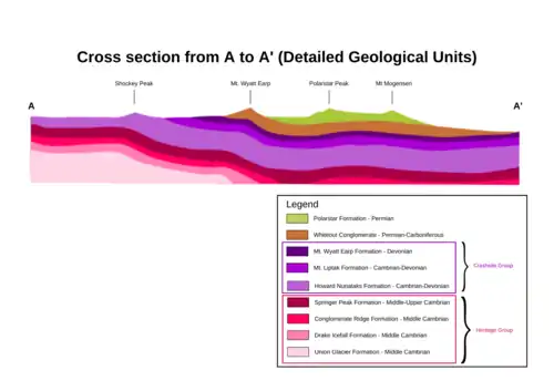 The Ellsworth Mountains display a 13-kilometre (8 mi) thick geologic sequence of Paleozoic sedimentary and volcanic rocks.[2] The Lower to Upper Cambrian Heritage Group is part of the lower Paleozoic series old rock strata.[2] The uppermost Cambrian to Devonian Crashsite Group makes up the middle portion of the geologic sequence,[2] while the Permian-Carboniferous Whiteout Conglomerate and Permian Polarstar Formation make up the remaining upper portion.[5]