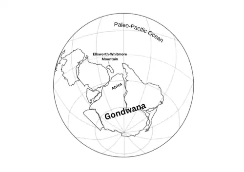 The pre-Gondwana breakup location of the Ellsworth Mountains in South Africa and the Weddell Sea region of the paleo-Pacific Margin are shown to have strong geological ties.[28] Several long-lasting orogenic events, including as the Ross orogeny in Antarctica, the Saldana orogeny in South Africa, and the Delamerian orogeny in Australia, took place along this boundary during the Cambrian period.[1] However, as the correlated orogenic event could not be detected in the Ellsworth Mountains, the crustal block on which the Ellsworth Mountains are situated has come to be viewed as geologically mysterious. The only evidence is that the rocks of the Ellsworth Mountains were created in a Cambrian extensional rift environment.[2]