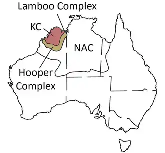 ![]() Map of Australia showing the Kimberley Craton (KC), Hooper Complex, Lamboo Complex and the North Australian Craton (NAC). | |