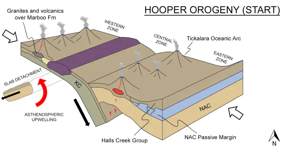 After the Hooper Orogeny, the downgoing slab, which had been deeply subducted into the asthenosphere, detached from the surface portion of the tectonic plate. The resulting change in isostasy temporarily buoyed the thinned-out Kimberley Craton section above the North Australian Craton, leading to the formation of the accretionary wedge of the Tickalara Arc, and setting the stage for the later suturing of the Kimberley Craton and North Australian Craton.[2]
