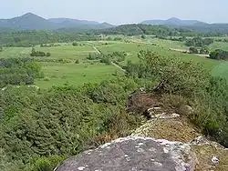 The Lower Buntsandstein, with a thickness of 280 to 380 meters, is the characteristic rock of the Palatinate Forest, dominating much of the upland except the southeastern Wasgau planation surfaces. It contains significant quartz but little feldspar and mica, weathering into sandy, nutrient-poor soils. The rugged terrain, with deeply incised valleys and rocky slopes, limited deforestation and agricultural use since the Middle Ages, preserving the forest's compactness. The Lower Buntsandstein features several hard rock zones separated by thin, clay-rich sandstone layers, divided into three sub-formations:[1][24][25]