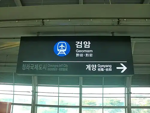 Geomam station is a railway station on AREX and Incheon Subway Line 2. Since June 2014, the KTX train operates from Incheon International Airport to Busan or Mokpo. It has stopped operating KTX since March 2018. In September 2018, Korail officially announced that they would stop operating KTX to Incheon International Airport due to lack of passenger use. This was the first KTX station after Incheon Airport. Before KTX started to run on AREX, all platforms were high-leveled with screen doors. The KTX started to run, they took away the platform screen doors only at the both end of the side horizontally and turned into low-leveled platform without screen doors.