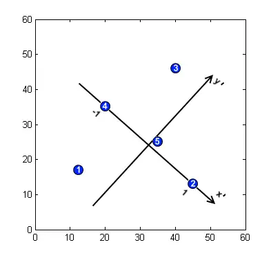 2. Introduce a basis to describe the locations of the feature points. For 2D space and similarity transformation the basis is defined by a pair of points. The point of origin is placed in the middle of the segment connecting the two points (P2, P4 in our example), the axis is directed towards one of them, the is orthogonal and goes through the origin. The scale is selected such that absolute value of for both basis points is 1.