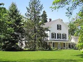 The George Baker House is a Greek Revival style farmhouse. The 1853 addition converted the house into an Upright and Wing configuration. The house is on the west side of Taylor Road at its intersection with McCormock Avenue just west of Illinois Route 53. It is built into the hillside of Baker Hill, with entrances on the first floor on the east and the second floor on the west. The three-story brick house is painted white with a partially exposed limestone foundation. The main entrance on the east side has a large porch; the historic main entrance was probably on the west. Windows are surrounded by brick lintels and limestone sills; the west windows have black shutters. Both doors have six-over-six windows on either side. The second floor has three windows on the east side, and side windows on the north and south. The addition has a door and window on the south side and a door and two windows on the east. There are two smaller windows on the west side of the addition. Two ground-level windows are also present on the west.